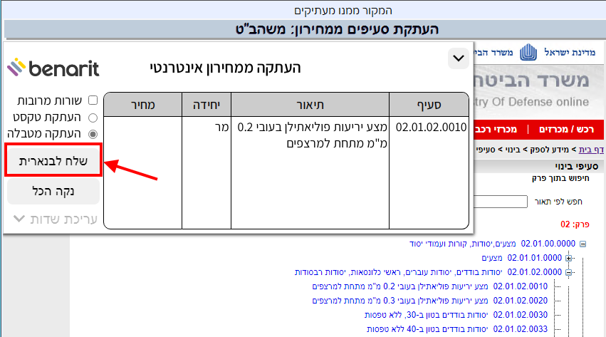 כדי להשלים את ההעתקה אל כתב הכמויות של בנארית, יש ללחוץ בתוסף ההעתקה על הכפתור “שלח לבנארית”: