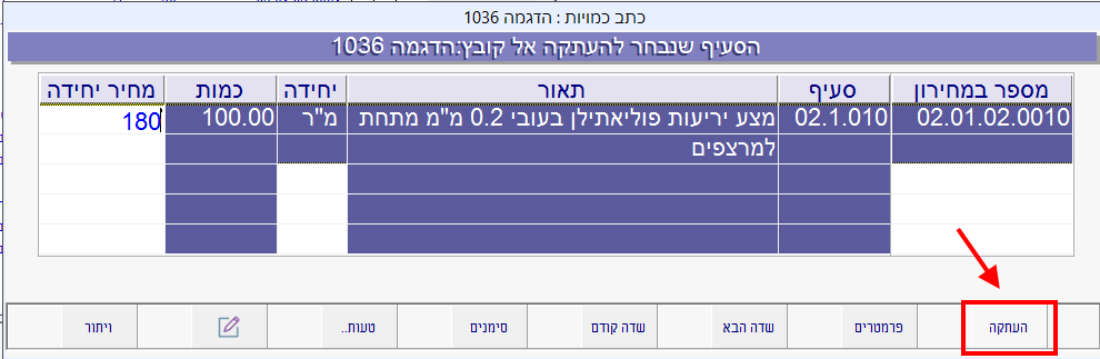 להשלמת העתקת הסעיף אל כתב הכמויות של בנארית, יש ללחוץ על הכפתור “העתקה”: