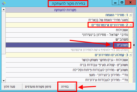 תחת הכותרת “מחירונים אינטרנטיים” יש לסמן את המחירון שממנו רוצים להעתיק סעיפים, וללחוץ על “בחירה”: