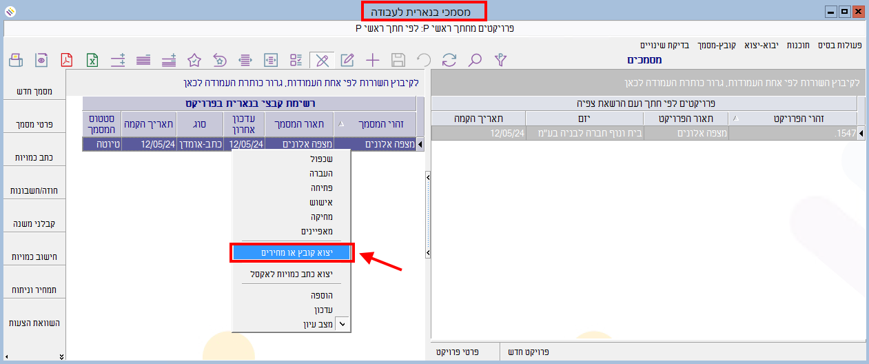 1. במסך “מסמכי בנארית לעבודה” יש ללחוץ לחיצה ימנית בעכבר על הקובץ המתומחר, ומהתפריט לבחור בפקודה “יצוא קובץ או מחירים”: