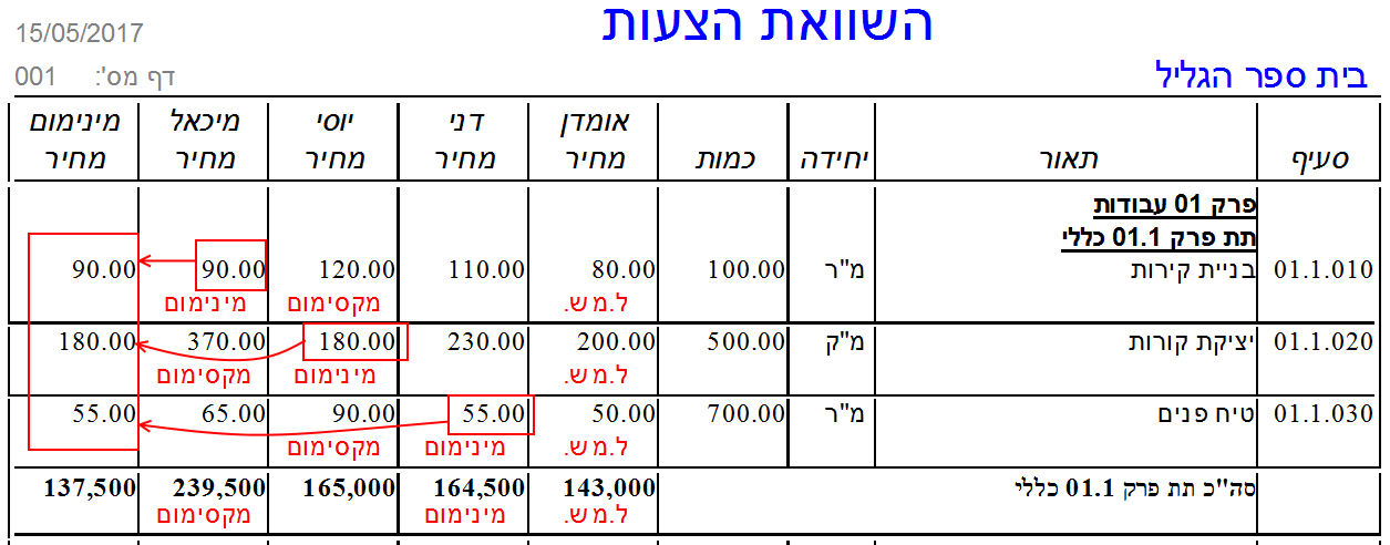 בסעיף 01.1.010 מחיר המינימום הוא 90, והוא נלקח אל העמודה “מינימום מחיר” מההצעה של מיכאל.