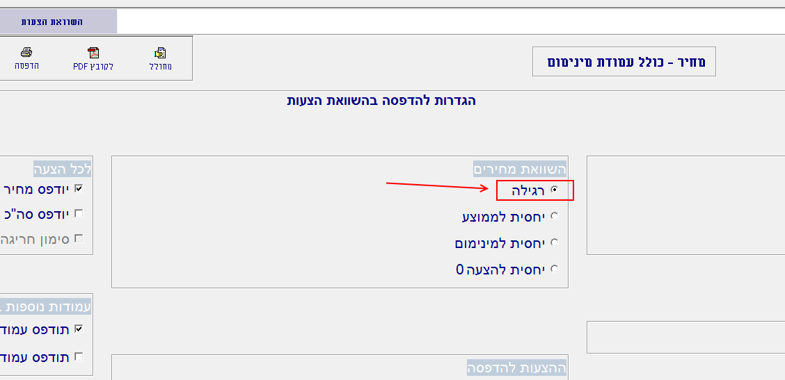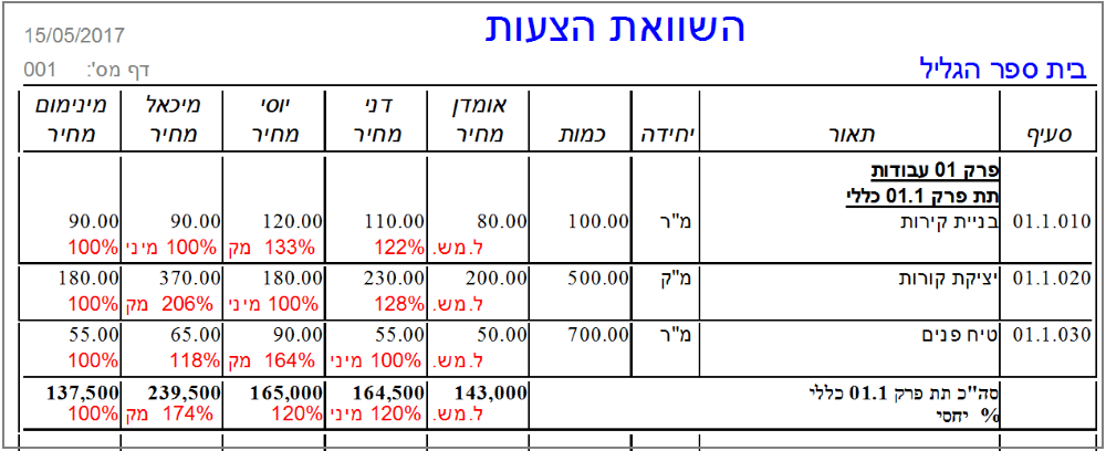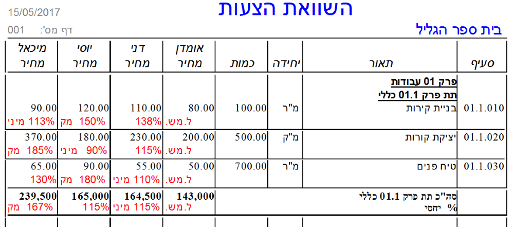 כאשר מפיקים דוח של השוואת הצעות קבלנים, ברירת המחדל היא להציג השוואת מחירים “רגילה”: