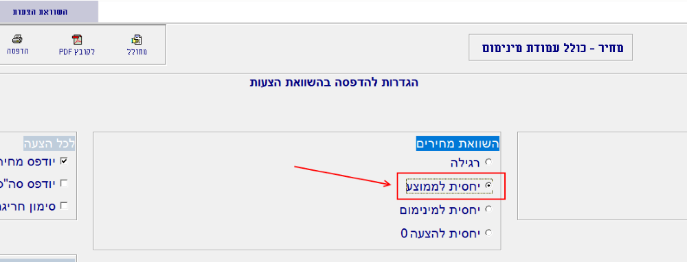 אפשר להפיק גם השוואת מחירים יחסית לממוצע/למינימום להצעת האומדן או יחסית להצעה כלשהי שנבחר. ואז,