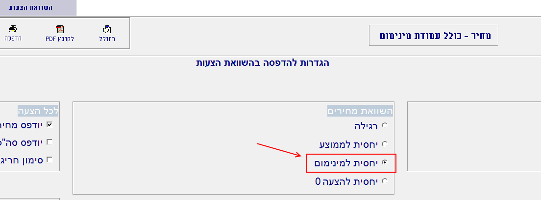 כאשר מפיקים השוואת מחירים יחסית לעמודת המינימום, עמודת המינימום מהווה את ה-100% שאליו התוכנה משווה את כל יתר ההצעות.