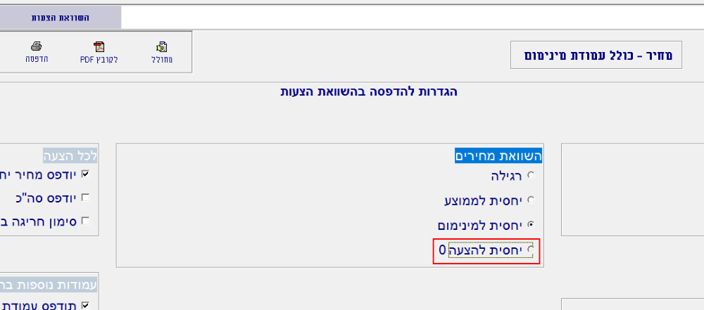 כדי להפיק את השוואת המחירים יחסית לאומדן או יחסית להצעה ספציפית של קבלן כלשהו, יש לסמן את האפשרות “יחסית להצעה 0”: