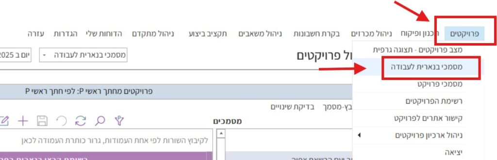 1. במסך הראשי, להיכנס לתפריט “פרויקטים” ולבחור “מסמכי בנארית לעבודה”: