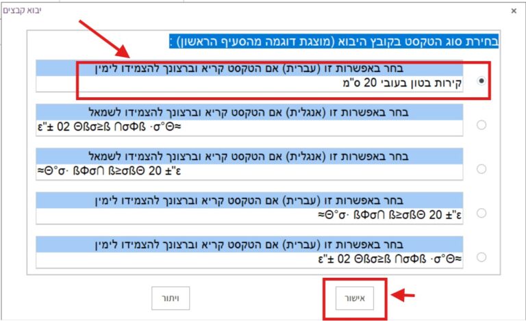 שימו לב: אם דוגמת הטקסט מהסעיף הראשון אינה תקינה (מופיעה בג’בריש) יש ללחוץ על הכפתור “אפשרויות נוספות” ובמסך שנפתח לבחור את האפשרות שמציגה את הטקסט בעברית תקינה ורק אז ללחוץ על “אישור”: