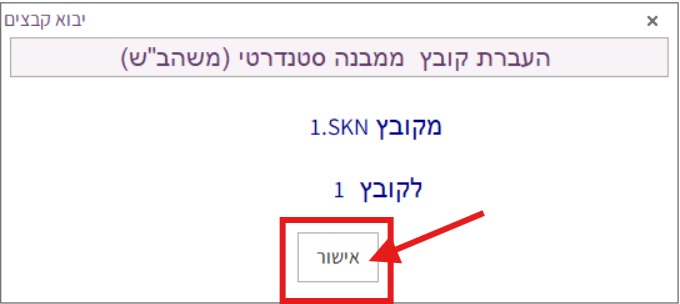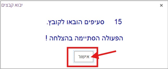 9. מופיעה הודעת אישור המציגה מידע על מספר הסעיפים שיובאו לקובץ. ללחוץ על “אישור”: