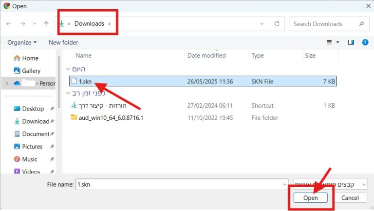 יש לסמן את הקובץ שרוצים לייבא וללחוץ על “Open”: