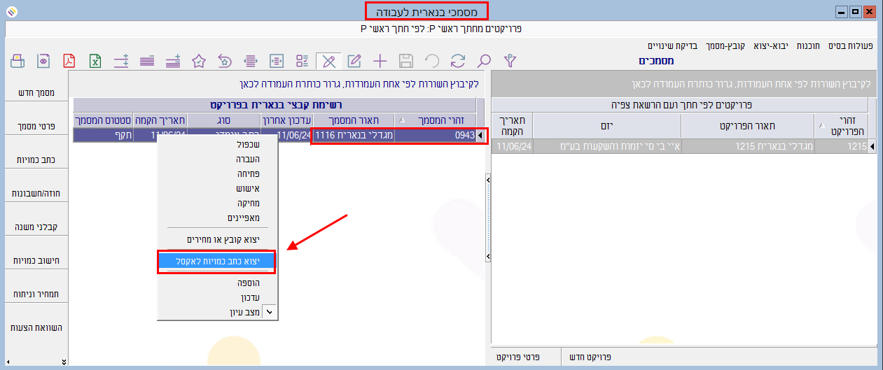 1. במסך “מסמכי בנארית לעבודה” ללחוץ לחיצה ימנית בעכבר על הקובץ שרוצים לייצא לאקסל, ובתפריט שנפתח לבחור בפקודה “יצוא כתב כמויות לאקסל”: