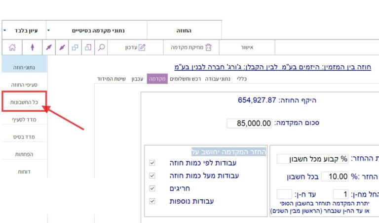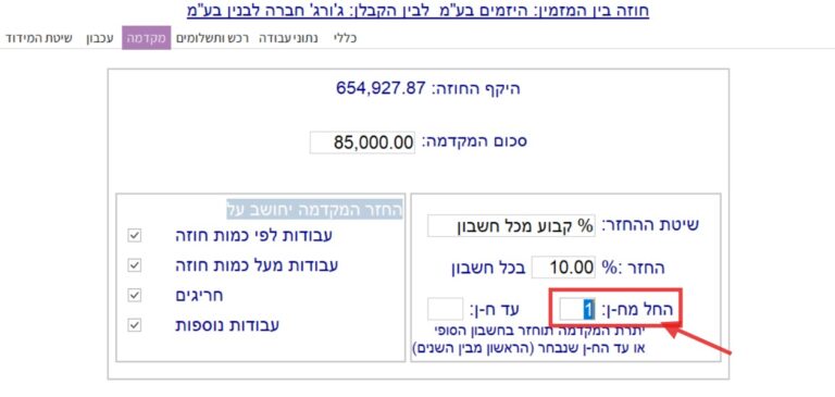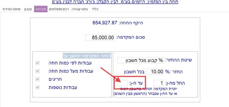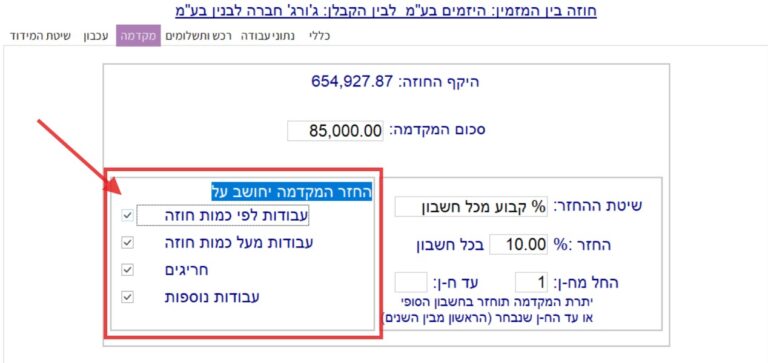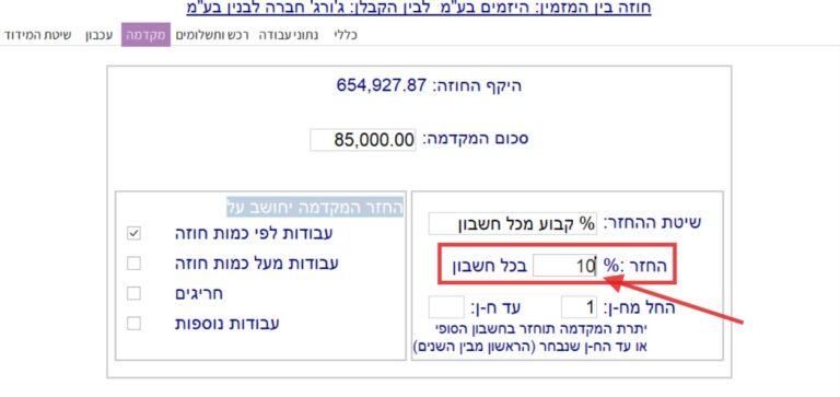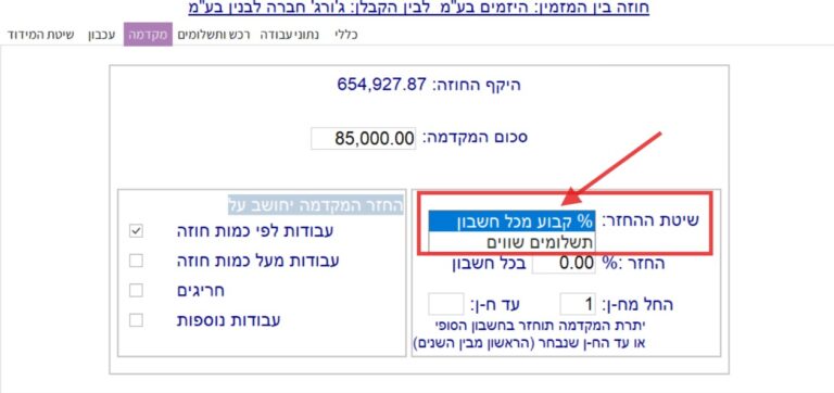 כאשר בוחרים “% קבוע מכל חשבון”, גובה הקיזוז של החזר המקדמה קשור לסכום העבודות שבוצעו בחשבון.