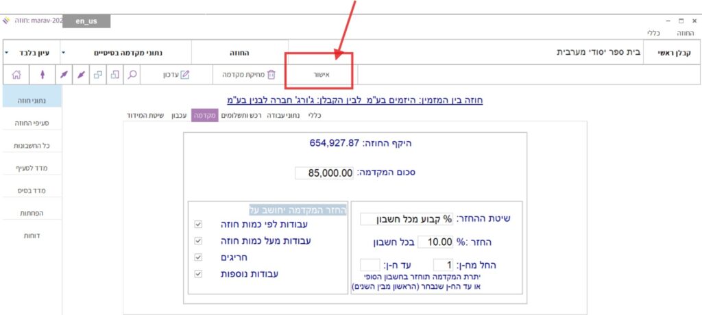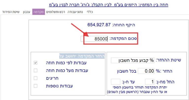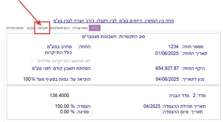 4. נפתח מסך נתוני החוזה. לעבור אל הלשונית “מקדמה”: