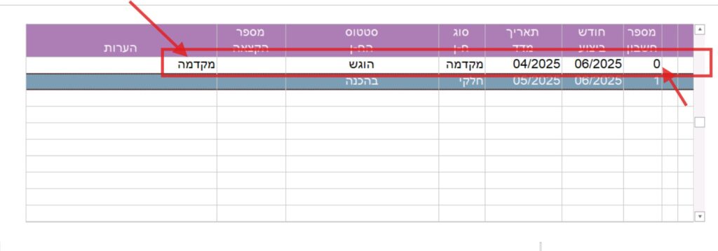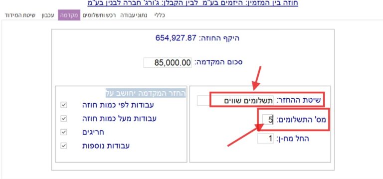 אם בשדה “שיטת ההחזר” בחרנו “תשלומים שווים”, יש לקבוע בשדה “מס’ התשלומים” את מספר התשלומים שבהם תוחזר המקדמה: