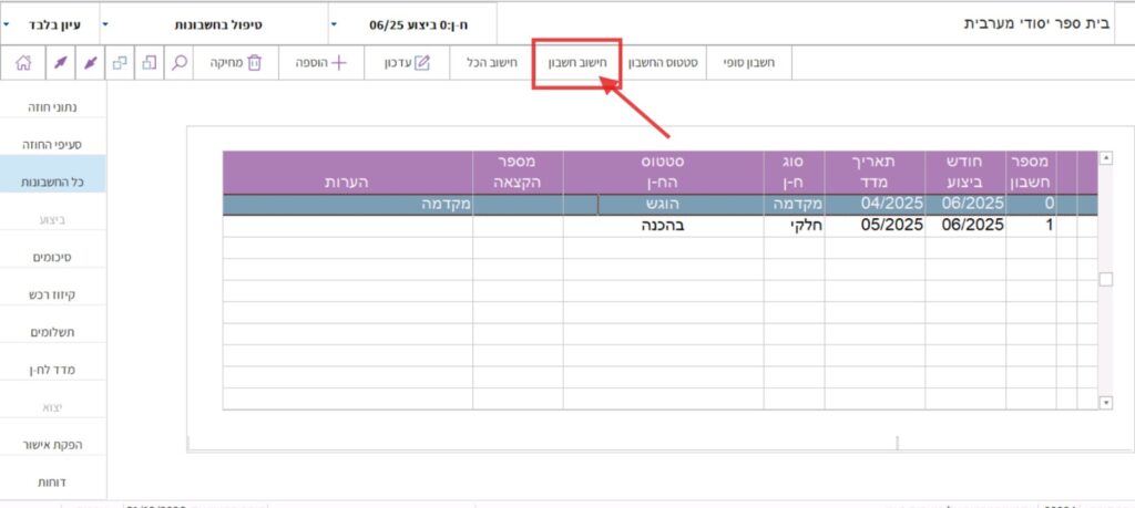 14. ללחוץ מעל הטבלה על הכפתור “חישוב חשבון”: