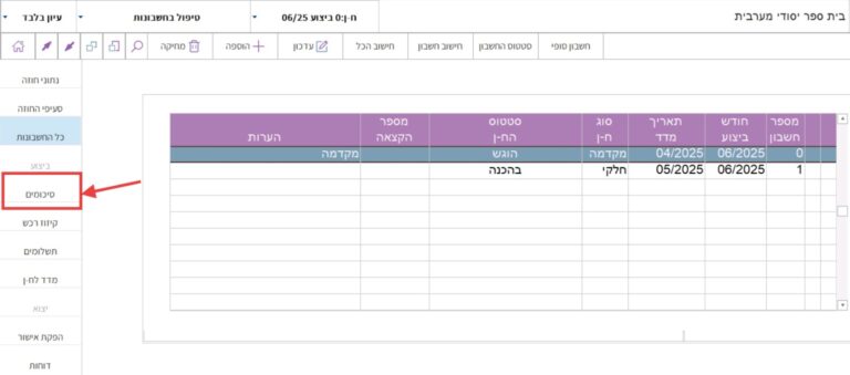 16. ניתן לעיין בריכוז של חשבון המקדמה באמצעות לחיצה על הכפתור “סיכומים” בסרגל השמאלי: