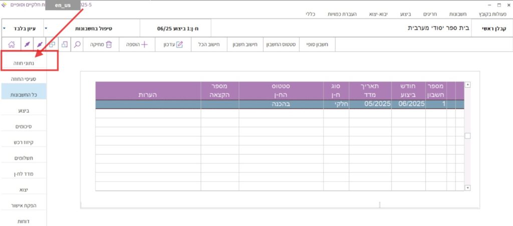 3. נפתח מסך החשבונות. ללחוץ למעלה על הכפתור “נתוני חוזה”: