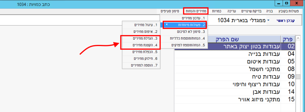 1. מתוך כתב הכמויות להיכנס למעלה לתפריט “מחירים והנחות” > להצביע על “פעולות מיוחדות” > ולבחור בפקודה “הגדלת מחירים” או “הקטנת מחירים”: