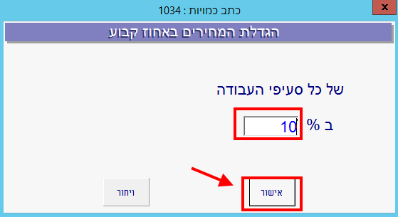 3. בחלונית שנפתחת להזין את האחוז שבו רוצים להגדיל או להקטין את המחירים, וללחוץ על “אישור”: