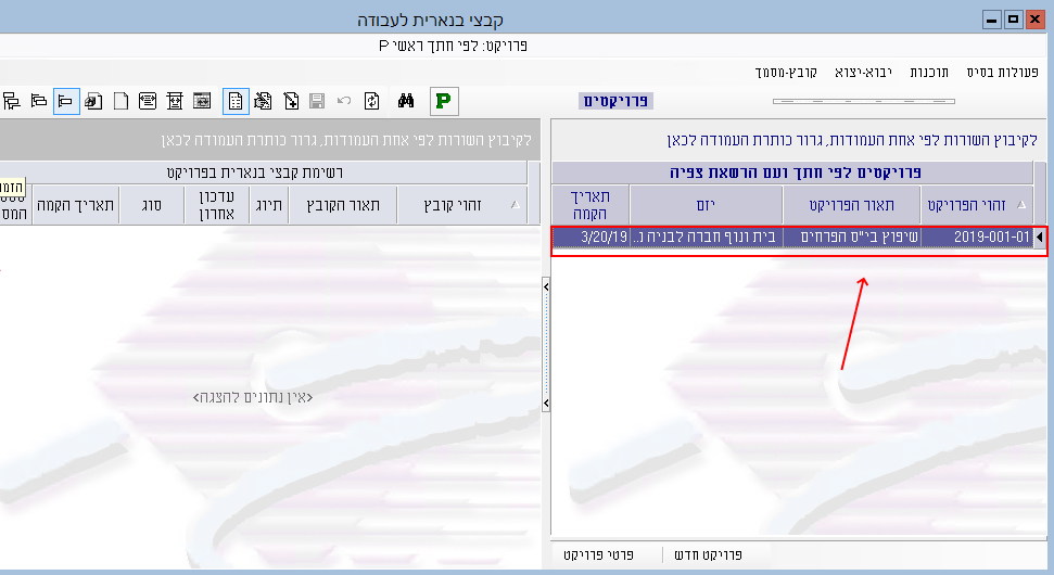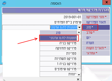 שימו לב: הכרחי לבחור בשדה סוג את האפשרות “הזמנות לה.מ ארגוני” כדי שניתן יהיה ליצור בפרויקט הזמנות עבודה מתוך הסכם מסגרת ארגוני. אם ייבחר סוג אחר מהרשימה, יווצר פרויקט רגיל שניתן להגדיר בו קבצים רגילים של כתבי כמויות ולא הזמנות עבודה.