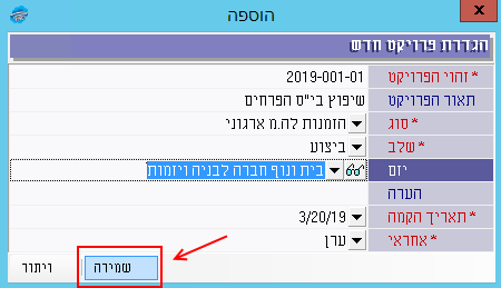 3.9 לאחר שמולאו כל השדות בחלונית “הגדרת פרויקט חדש” ללחוץ על “שמירה”: