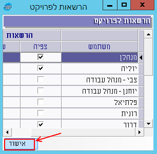 המשתמש שיצר את הפרויקט מקבל באופן אוטומטי הרשאות צפיה ושינוי בפרויקט, וכל משתמש מסוג מנהלן מקבל אוטומטית הרשאת צפיה. ניתן להוסיף הרשאות בהתאם לצורך. לסיום ללחוץ על “אישור”: