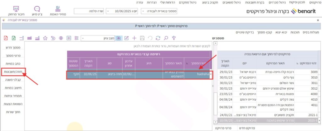 1. במסך “מסמכי בנארית לעבודה”, יש לסמן את המסמך שאליו רוצים לייבא את החשבון, ואז ללחוץ בצד שמאל על הכפתור “חוזה/חשבונות”:
