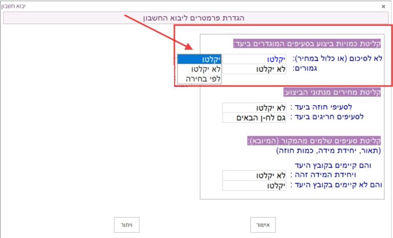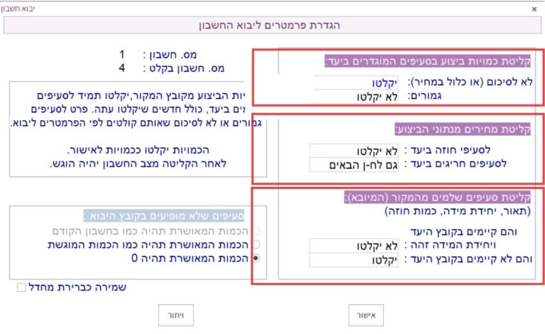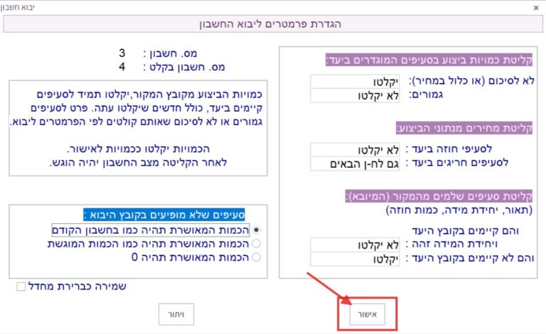 8. לאחר שנבחרו כל האפשרויות הרצויות במסך “הגדרת פרמטרים ליבוא חשבון”, יש ללחוץ על “אישור”: