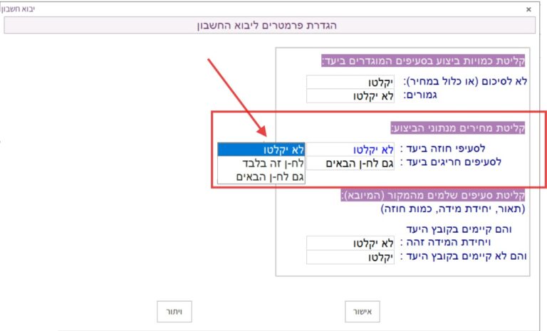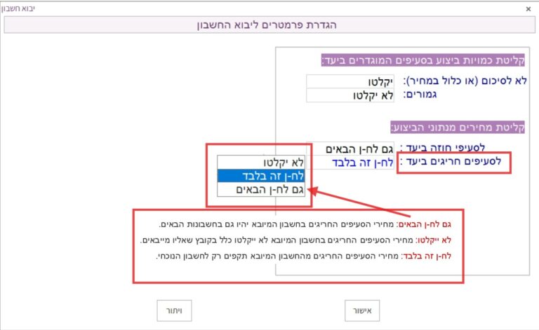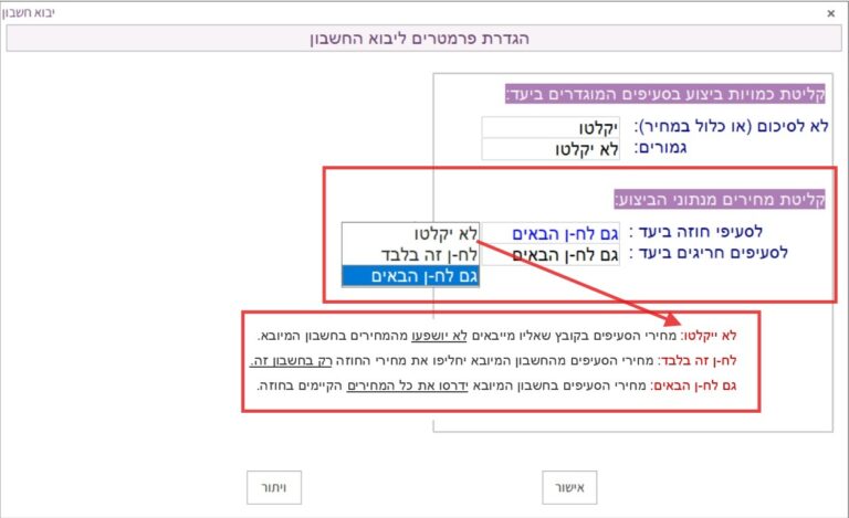 אם ברירת המחדל הזו אינה רצויה, אפשר לבחור באמצעות הפרמטר שלא ייקלטו כלל מחירים לסעיפים חריגים,או שהמחיר שייקלט ישפיע רק על החשבון הנוכחי: