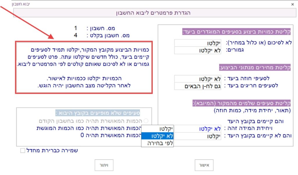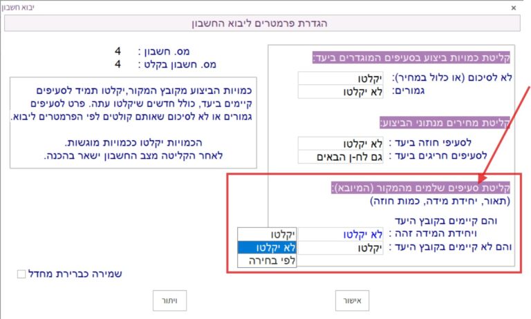 לגבי קליטת סעיפים חדשים שנמצא בתהליך יבוא החשבון שהם כבר קיימים בקובץ היעד – ברירת המחדל היא שהם לא ייקלטו.