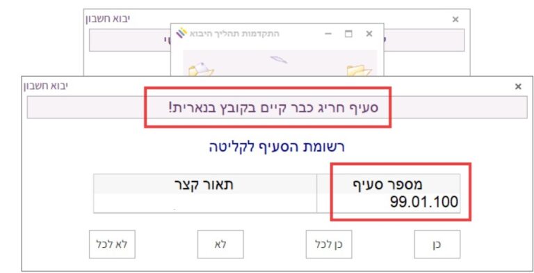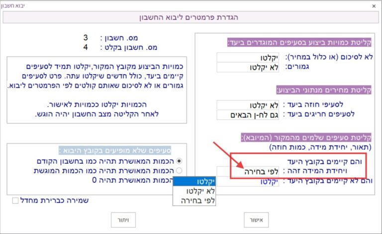 עם זאת, הצד המייבא יכול להחליט לא לקלוט את הסעיף החדש, למרות שהוא לא קיים אצלו בקובץ היעד שאליו מייבאים, או לחילופין לבחור באפשרות “לפי בחירה“, ואז תוכן הסעיף יוצג תוך כדי תהליך יבוא החשבון כדי שהמשתמש יוכל להחליט לגבי כל סעיף כזה אם לקלוט או לא לקלוט אותו: