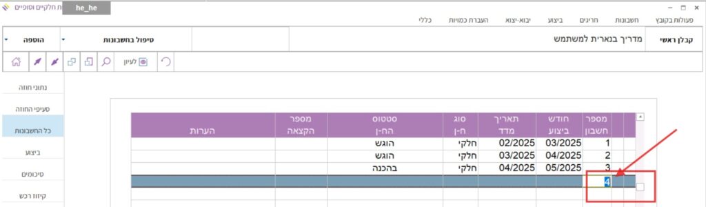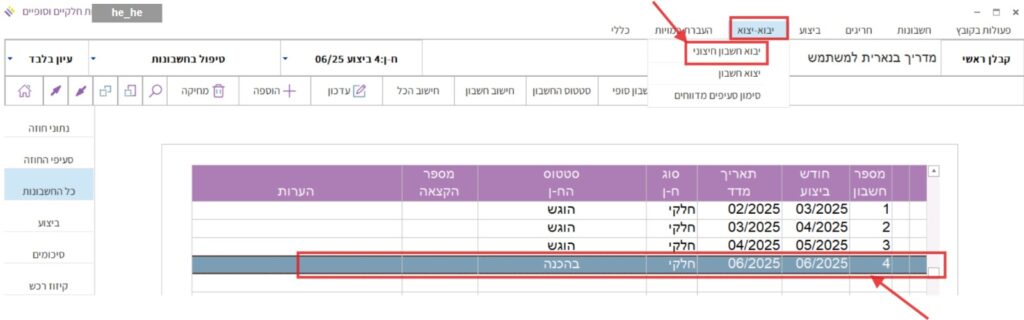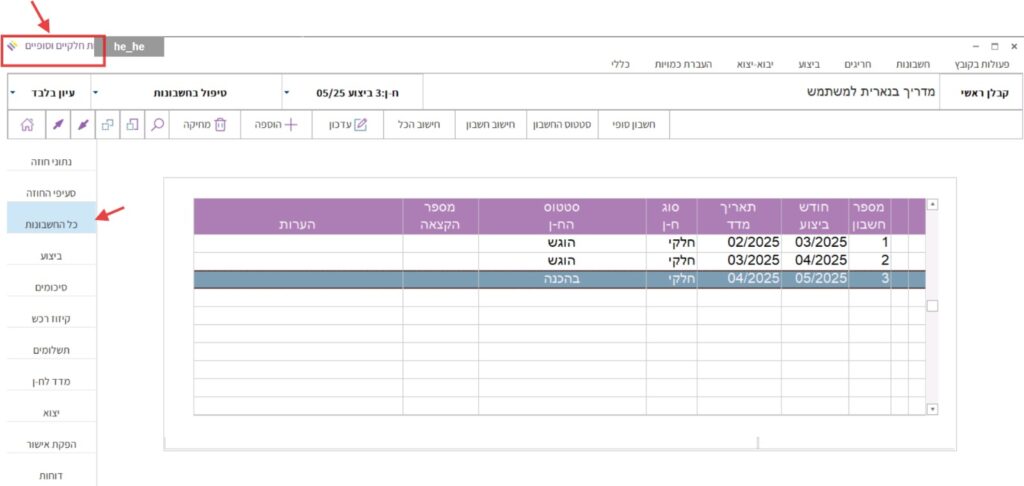2. נפתח המסך “חשבונות חלקיים/סופיים”: