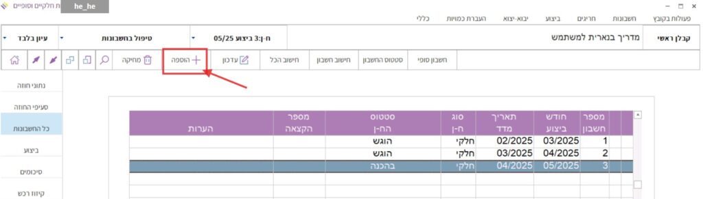 3. ללחוץ בסרגל שמעל טבלת החשבונות על כפתור “+הוספה” כדי להוסיף שורה של חשבון חדש: