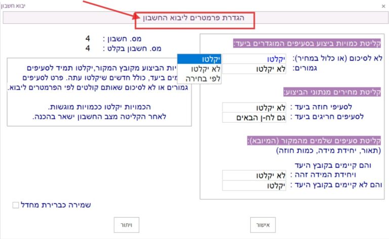 לגבי קליטת סעיפים חדשים שנמצא בתהליך יבוא החשבון שהם לא קיימים בקובץ היעד – ברירת המחדל היא שהם ייקלטו.