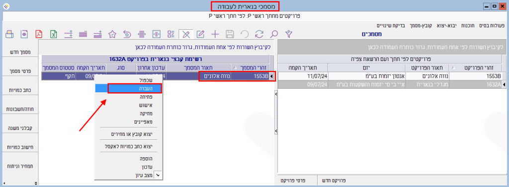 1. במסך “מסמכי בנארית לעבודה” ללחוץ לחיצה ימנית על המסמך שרוצים להעביר > ומהתפריט שנפתח לבחור בפקודה “העברה”: