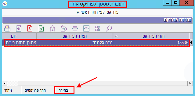 יש לסמן את הפרויקט שאליו מעוניינים להעביר את הקובץ/מסמך וללחוץ למטה על הכפתור “בחירה”: