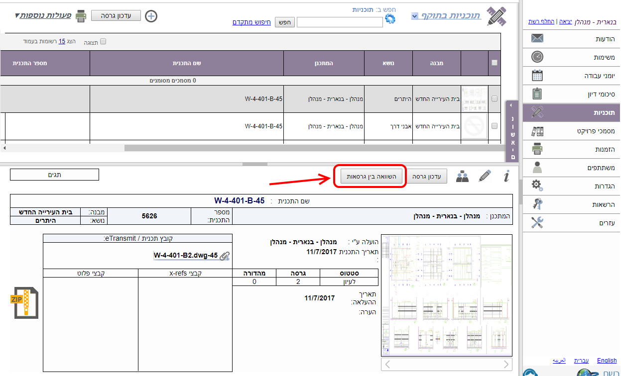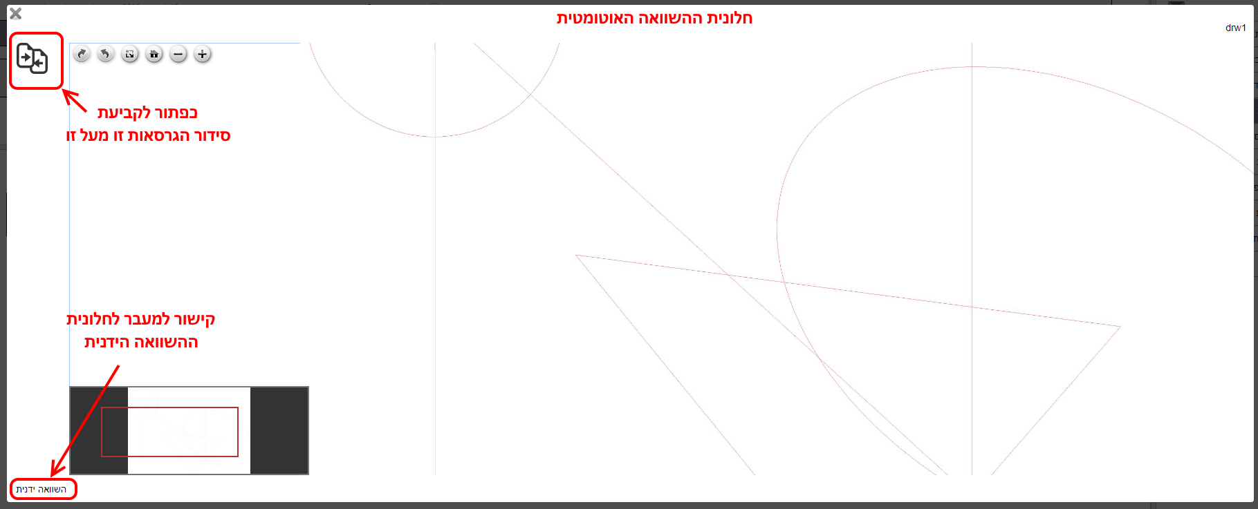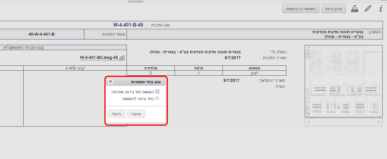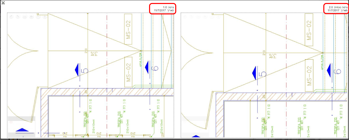 3. אם ההשוואה האוטומטית בין הגרסה העדכנית של התוכנית לבין הגרסה הקודמת לא הושלמה בהצלחה, תיפתח חלונית של השוואה ידנית שמציגה את הגרסה העדכנית ואת הגרסה הקודמת זו לצד זו, עם אפשרות לעשות זום אין ולהזיז את השרטוט למקום הרצוי כדי להשוות אזורים שונים בשרטוט. מעל כל גרסה מופיע מספר הגרסה והתאריך בו הועלתה.