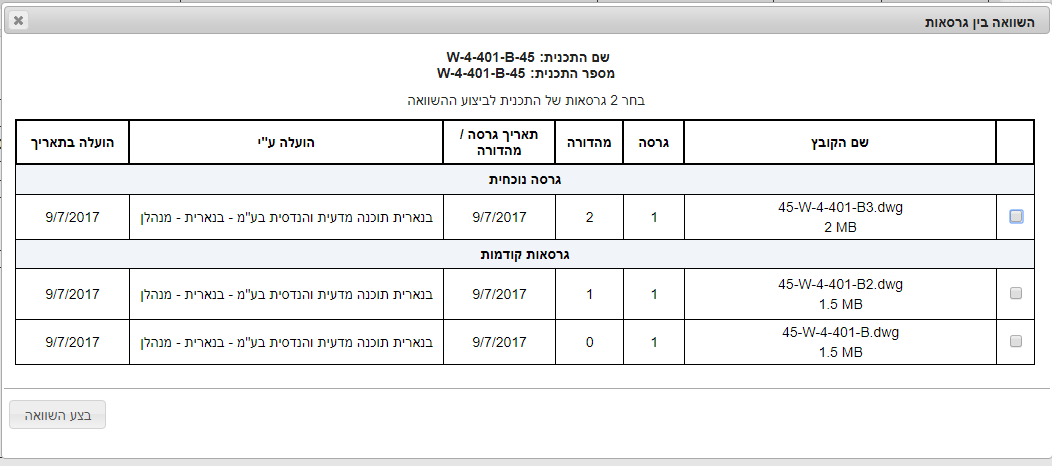 4. אם קיימת לתוכנית יותר מגרסה אחת קודמת, לחיצה על הכפתור “השוואה בין גרסאות” תפתח חלונית שבה צריך לבחור האם להשוות מול הגרסה האחרונה או מול גרסה אחרת מתוך רשימת הגרסאות הקודמות: