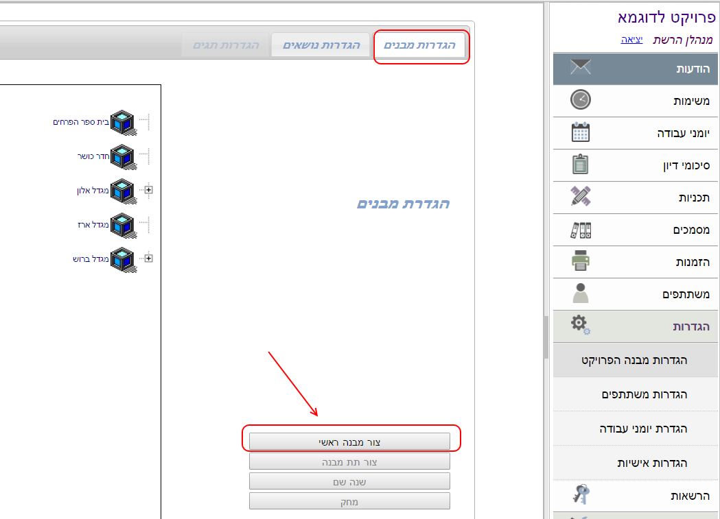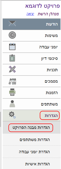 בתפריט הראשי ללחוץ על “הגדרות” > “הגדרות מבנה הפרויקט“: