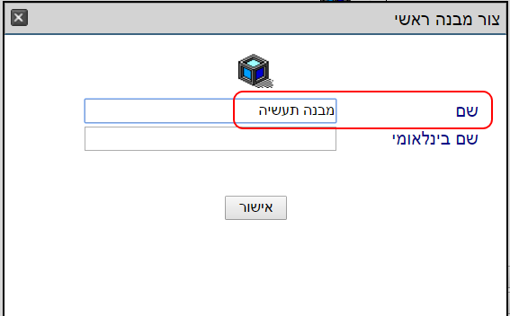 3. בחלונית “צור מבנה ראשי” להזין את שם הפרויקט בשדה “שם” וללחוץ על “אישור“: