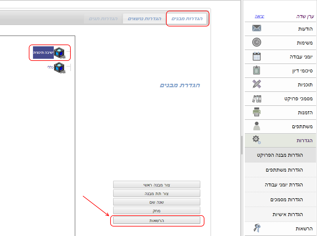 בלשונית “הגדרות מבנים” לסמן את המבנה שלגביו רוצים להגדיר את הרשאות המשתתפים, ולאחר מכן ללחוץ על “הרשאות“: