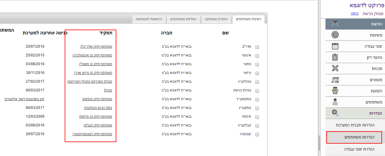 בעמודה “תפקיד” הן את סוג התפקיד שאליו הוא משוייך והן את התפקיד שהוגדר לו (התפקיד מופיע בסוגריים):