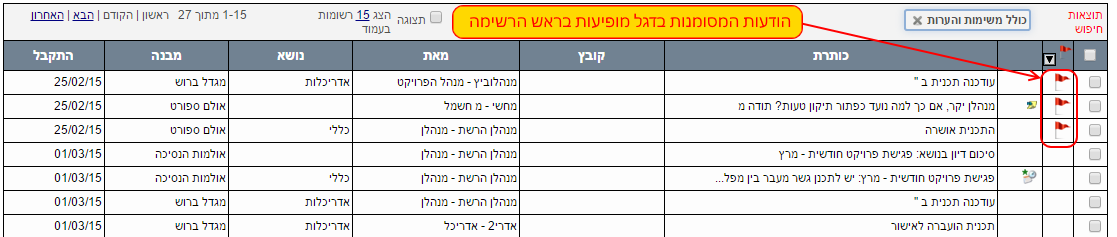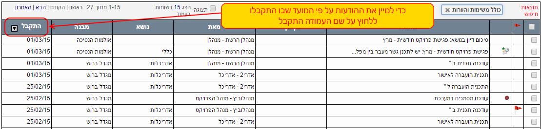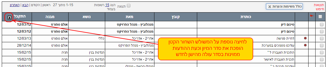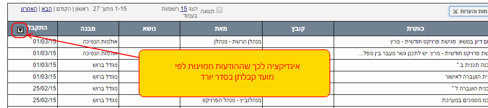 כדי לשנות את מיון ברירת המחדל, יש ללחוץ על שם העמודה שלפיה רוצים למיין. למשל, אם רוצים למיין את ההודעות על פי המועד שבו התקבלו, יש ללחוץ על שם העמודה “התקבל”: