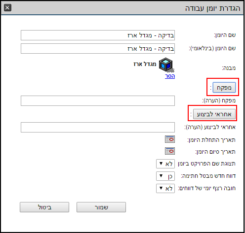 1. מתפריט “הגדרות” > לבחור “הגדרת יומן עבודה”. 2. בחלון “הגדרת יומן עבודה” לוחצים על הכפתור “מפקח” או “אחראי לביצוע”: