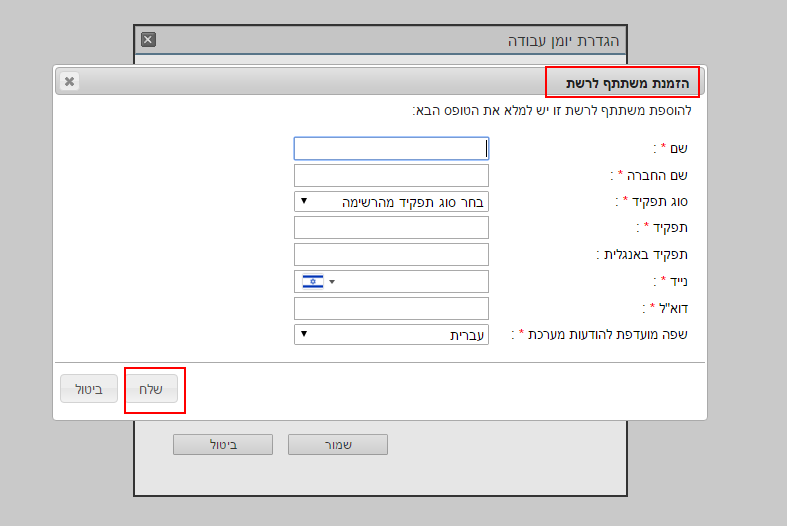 4. נפתחת חלונית להזמנת משתתף. ממלאים את פרטי המשתתף שרוצים להזמין ולוחצים על “שלח”: