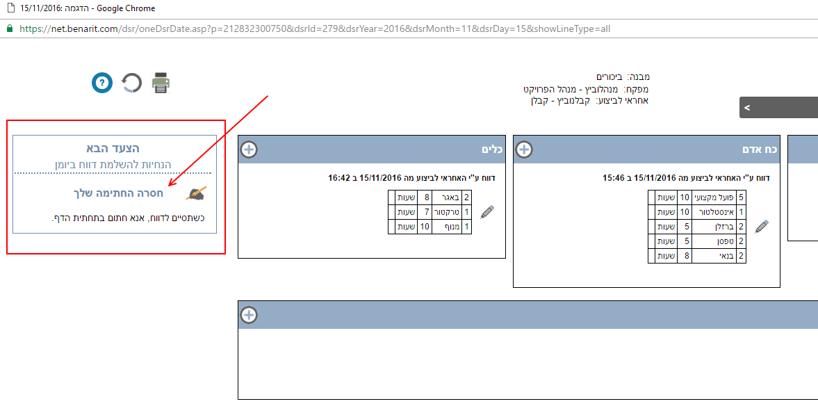 כדי לעזור במילוי יומן העבודה, מופיעה בצד שמאל של הדף ביומן העבודה תיבת “הצעד הבא” ובה הנחיה לגבי הפעולה הבאה שנדרש לבצע. להמחשה, במצב שבו הדף ביומן נמצא כעת, צריך הצד שמילא את הדיווחים לחתום על היום ביומן, וזו ההנחיה שמופיעה בתיבת “הצעד הבא“: