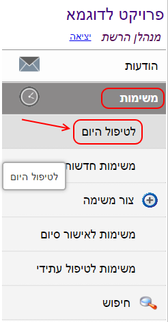 - בתפריט הראשי ללחוץ על “משימות” > “לטיפול היום“: (משימות מוגדרות כמשימות “לטיפול היום” אם תאריך ההתחלה שלהן חל היום, או אם תאריך ההתחלה שלהן כבר עבר ועדיין לא הסתיים הטיפול בהן)