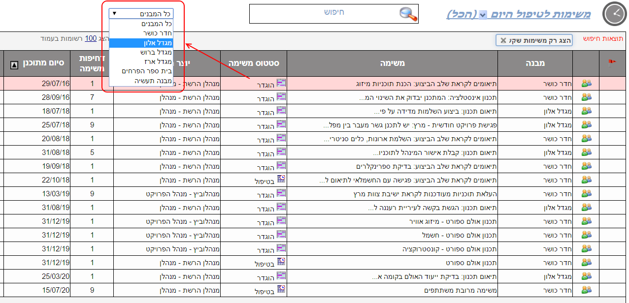 3. כדי לצמצם את רשימת המשימות רק למשימות הקשורות למבנה מסוים, יש לפתוח למעלה את רשימת המבנים ולבחור את המבנה הרלוונטי: