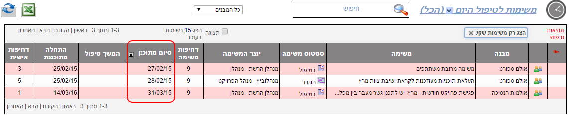 כדי למיין את המשימות לפי תאריך הסיום המתוכנן יש לבצע את הפעולות הבאות: