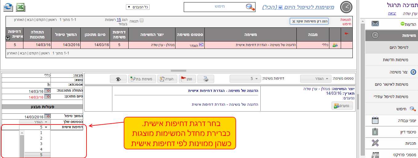 כדי להגדיר דרגת דחיפות אישית למשימה, יש לבצע את הפעולות הבאות: