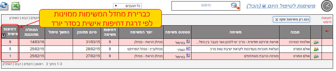 3. הגדרת דרגת דחיפות אישית מסייעת בהצגת רשימת המשימות בהתאם לסדר שבו אתה רוצה לטפל בהן, כיוון שכברירת מחדל המשימות מוצגות על פי סדר הדחיפות האישית מהגבוה לנמוך:
